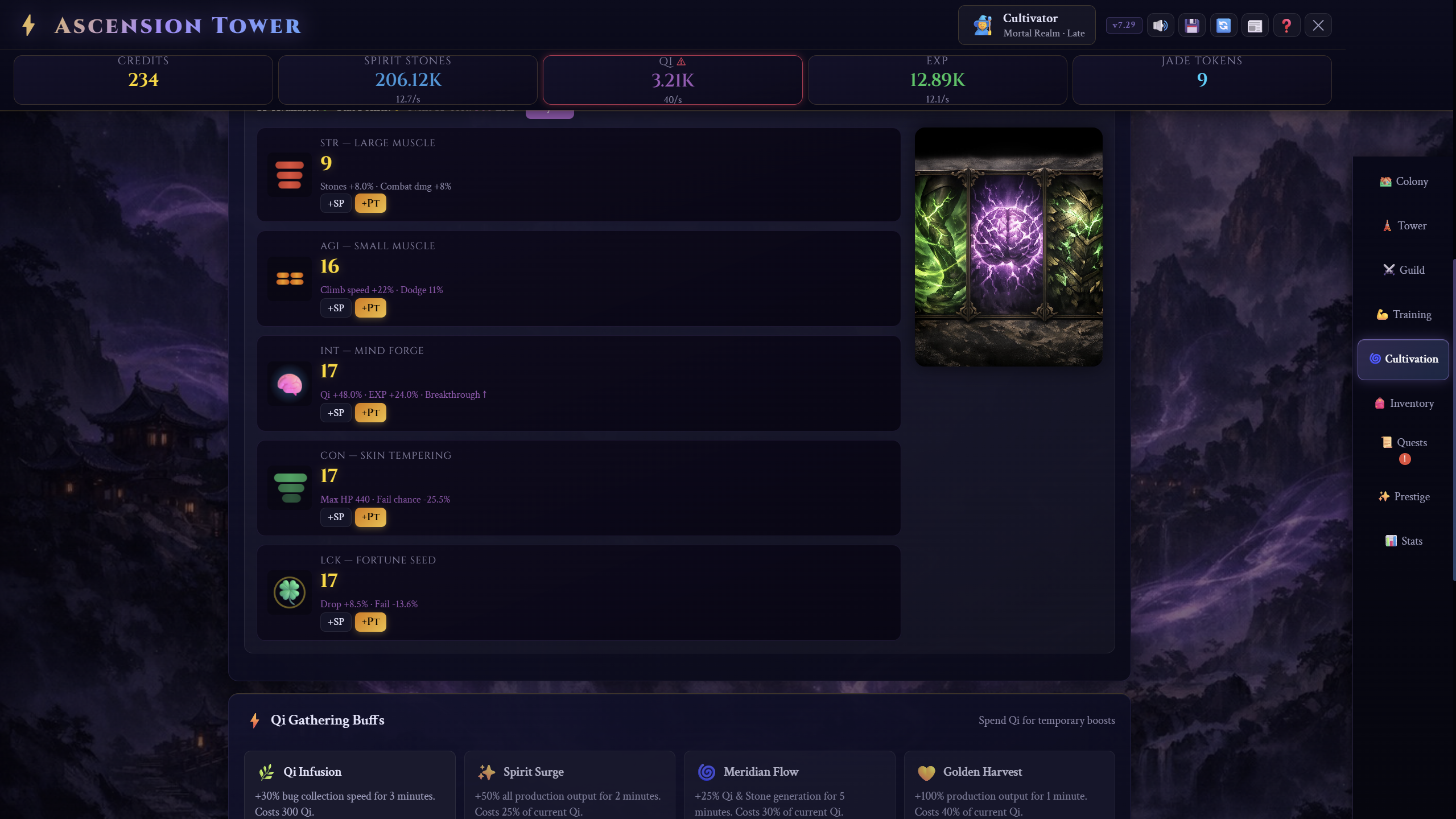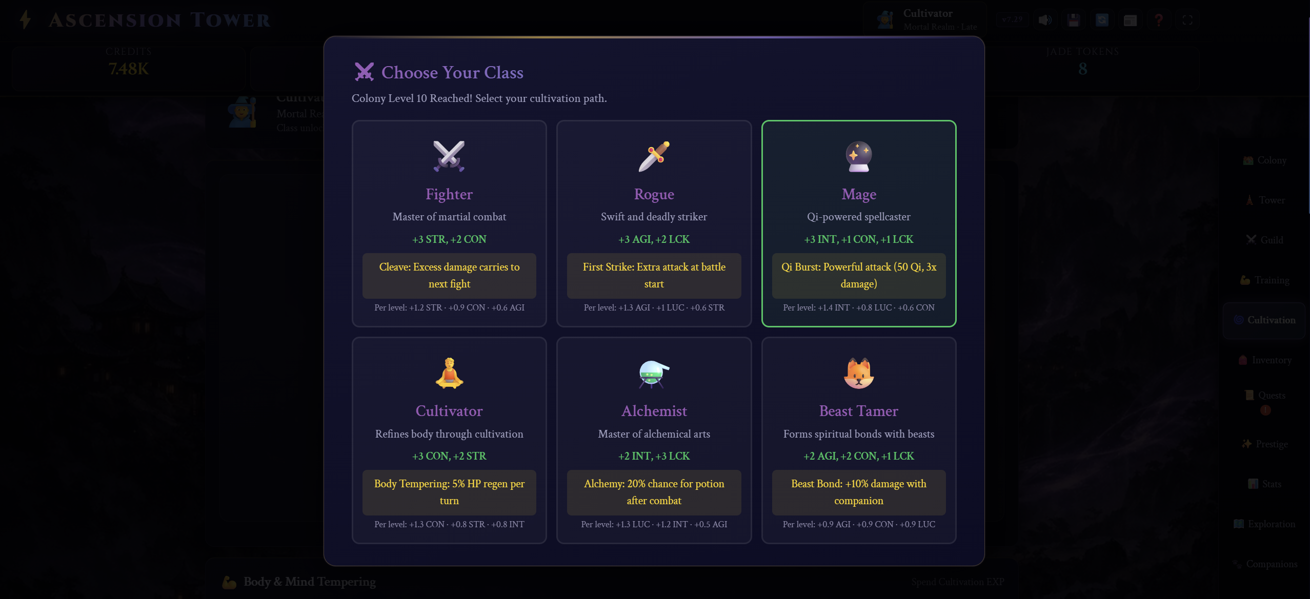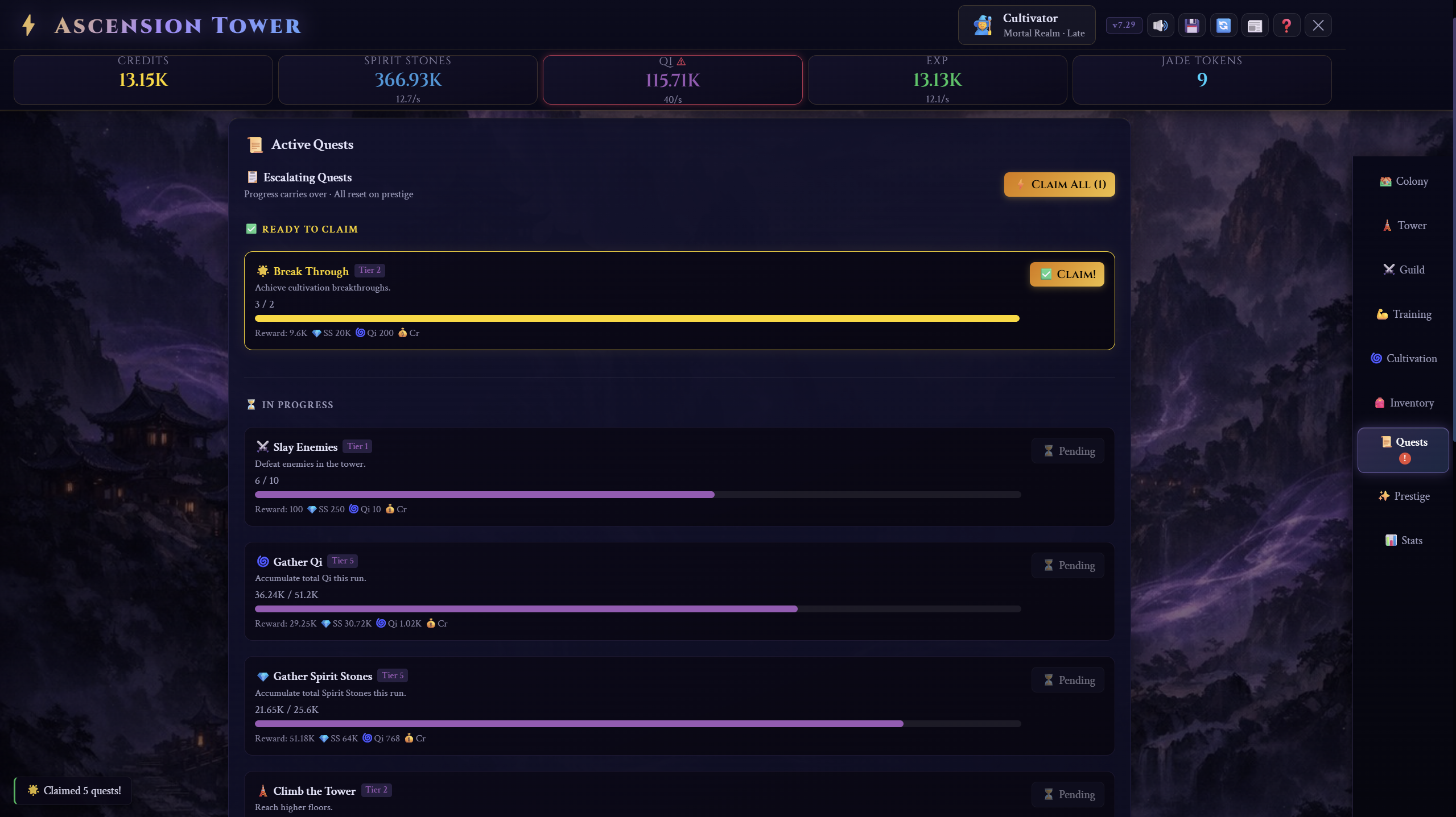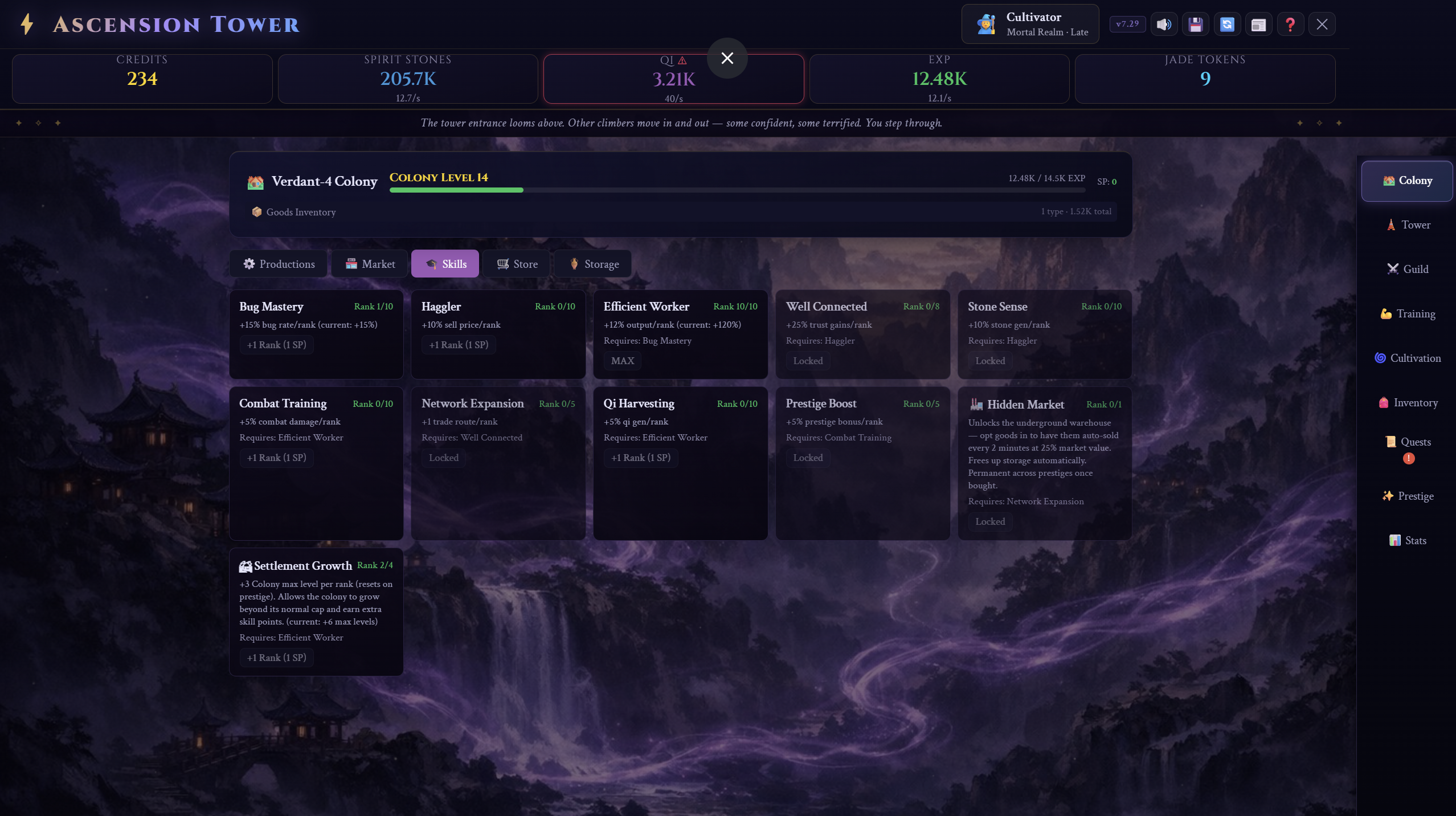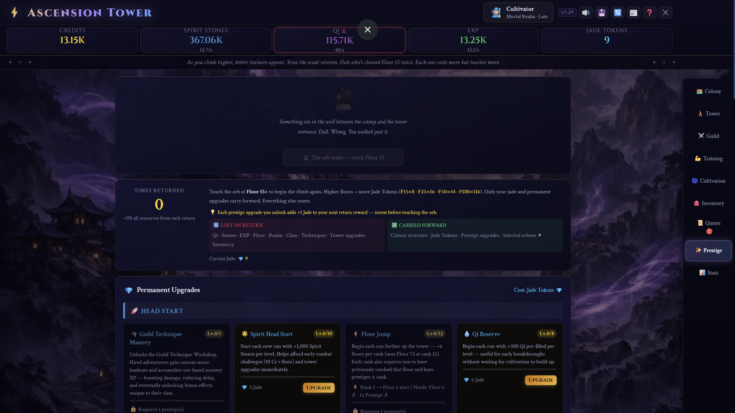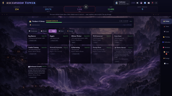 Ascension Tower is a dark fantasy, wuxia-inspired idle-management RPG set inside a vast, unknowable structure. Use credits and QI to level up and Climb a monolithic tower rising from a war-torn world. Prestige to gain access to Jade tokens and incredible upgrades.
